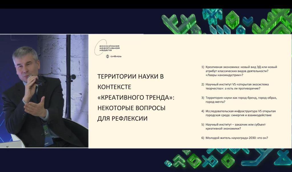 14 ноября 2025 года в рамках Российской креативной недели в Красноярске состоялась сессия «Города с интеллектуальным потенциалом или наукограды 2.0. От центра науки к городу для жизни и творчества». Модератором выступил Александр Панин, директор центра геодемографии и пространственного развития МГУ имени М.В. Ломоносова, руководитель ИЦ «Картфонд.рф». В дискуссии принимали участие Алексей Васильев, Заместитель директора Института ядерной физики имени Г.И. Будкера СО РАН (Новосибирск); Ксения Николаева, Руководитель бюро территориальных исследований «Благоника» (Москва); Александр Сувалко, Заместитель директора Института исследований культуры НИУ ВШЭ, ведущий эксперт АНО «Креативная экономика» (Москва-Дубна); Владимир Терентьев, глава ЗАТО Зеленогорск (Красноярский край); Екатерина Шугрина, профессор кафедры конституционного права СПбГУ (Москва).