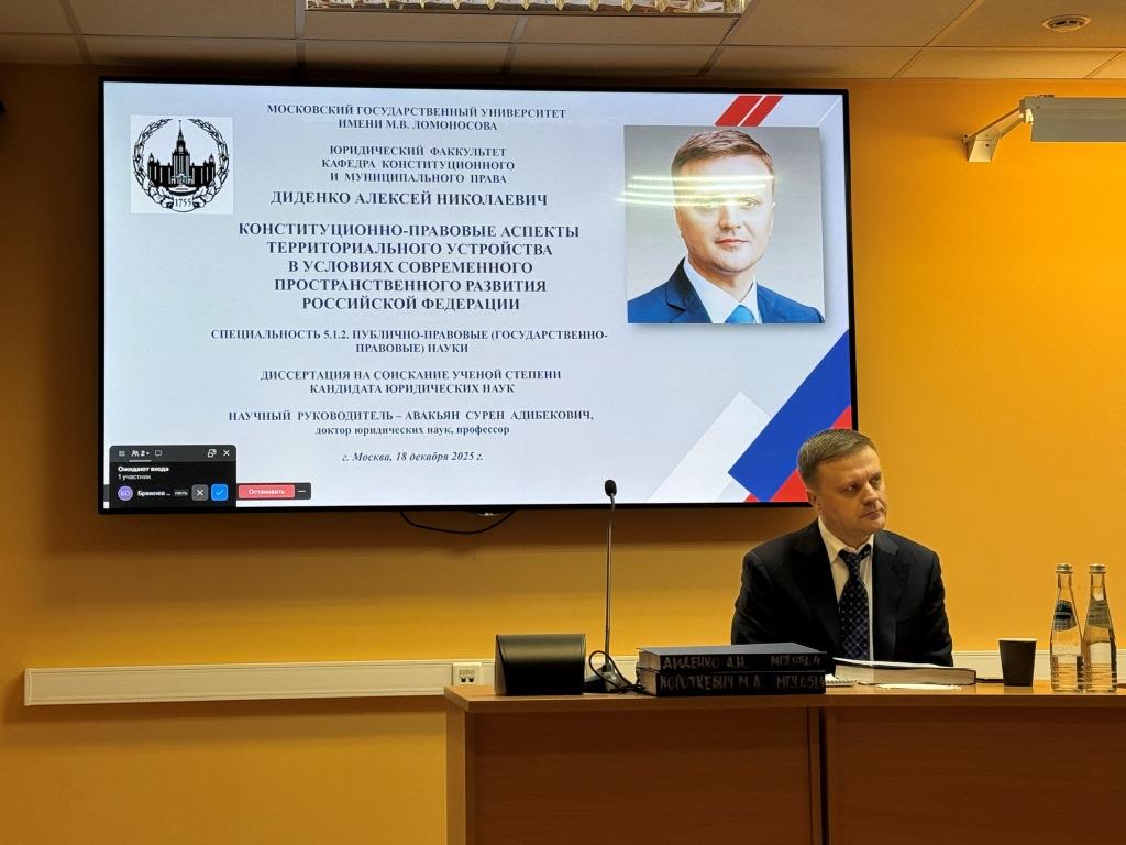 18 декабря 2025 года состоялась успешная защита кандидатской диссертации А.Н. Диденко на тему «Конституционно-правовые аспекты территориального устройства в условиях современного пространственного развития Российской Федерации». Научный руководитель – профессор С.А. Авакьян. Вместе со мной в качестве официальных оппонентов выступали профессора А.А. Ларичев (НИУ ВШЭ) и Л.Т. Чихладзе (РУДН).